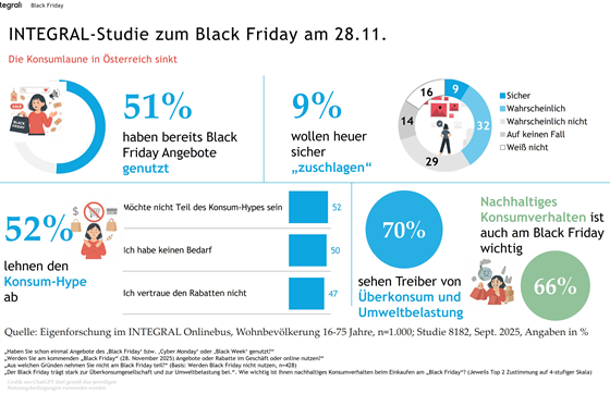 Die aktuelle INTEGRAL-Studie zeigt eine zunehmende Skepsis gegenüber dem Black Friday in Österreich, obwohl der Aktionstag allgemein bekannt ist. Fast alle Befragten (97 %) kennen das Ereignis, nur jedoch eine kleine Minderheit (9 %) plant aktiv Einkäufe an diesem Tag, während etwa ein Drittel (32 %) wahrscheinlich daran teilnehmen wollen.