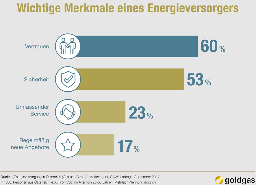 Die Ergebnisse der goldgas-Studie bestätigen das Sicherheitsbedürfnis der Konsumenten: Rund 60 Prozent der befragten Personen bewerten „Vertrauen“ in den Energieversorger als wichtigstes Merkmal, gefolgt von „Sicherheit“, die für 53 Prozent der wichtigste Faktor ist. Gefragt nach den konkreten Erwartungen an den optimalen Energieanbieter, geben jeweils drei Viertel der Personen die garantierte Versorgungssicherheit (75 %) und die transparente und verständliche Abrechnung (72,2 %) an.