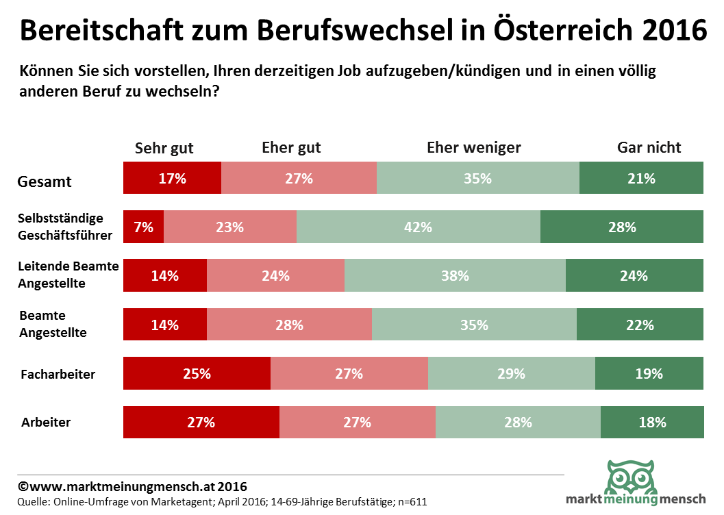 44 Prozent der Österreichischen Berufstätigen können sich vorstellen ihren Job aufzugeben und in einen völlig neuen Beruf zu wechseln. Bei den Arbeitern sind es gar 54 Prozent, bei leitenden Beamten und Angestellten 38 Prozent.