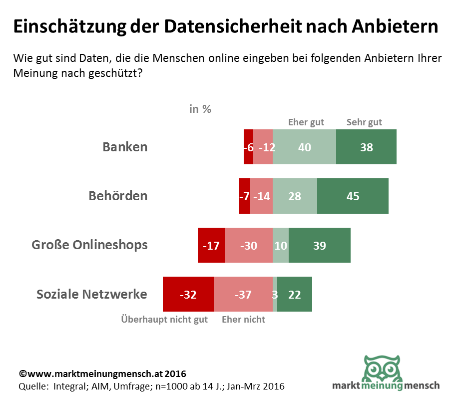 76 Prozent der österreichischen Internetuser wähnen ihre online eingegebenen persönlichen Daten bei Banken zumindest eher aufgehoben. Auch Behörden und großen Online-Shops genießen noch eine positive Vertrauensbilanz punkto Datensicherheit. Soziale Netzwerke genießen kaum Vertrauen hinsichtlich Datenschutz. 69 Prozent der Onliner vermuten hier eher Böses.