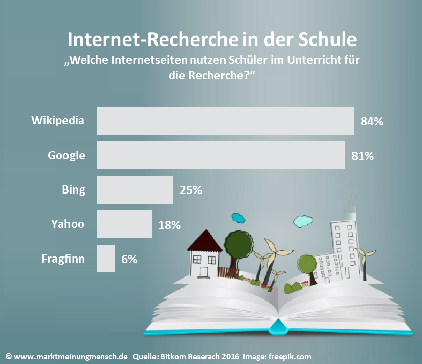 Die meisten deutschen Lehrer setzen, laut einer Umfrage der Bitkom, im Unterricht auf die selbstständige Online-Recherche ihrer Schützlinge. Die Mehrheit der Schüler benötigen bei der Internetrecherche kaum Hilfe. Wikipedia und Google sind die meist genutzten Online-Lexika.Titel-Icon: ©freepik