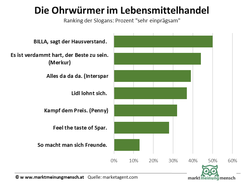 Billa führ mit seinem "Hausverstand" das Ranking der einprägsamsten Werbeslogans im Lebensmittelhandel an. An zweiter mit "es ist verdammt hart dert Beste zu sein" ein Slogan der bereits ein knappes Jahr "Off the Air" ist. Der Nachfolge-Spot von Merkur konnte sich bisher nur auf Platz 7 hochkämpfen.Die einprägsamsten Slogans des österreichischen Lebensmittelhandels