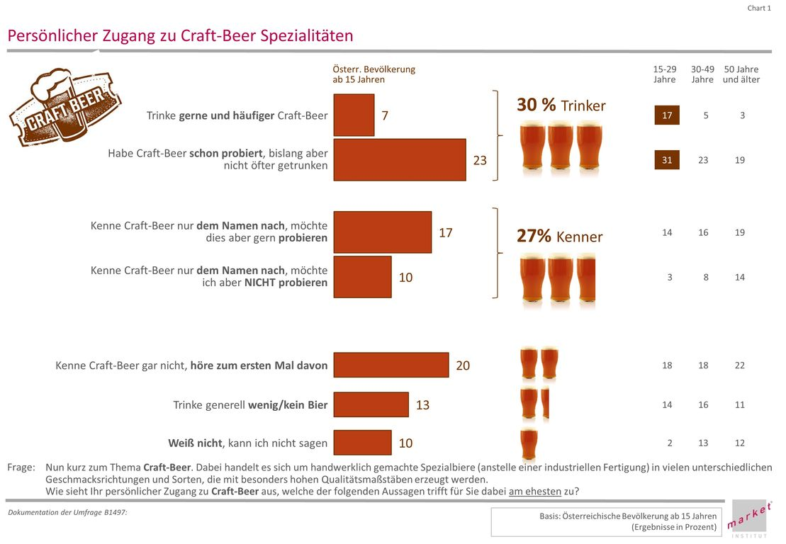 Knapp ein Drittel der Österreicher hat persönliche Erfahrungen mit dem Kultgetränk Craft-Beer gemacht und die diversen Angebote zumindest probiert, jeder Sechste möchte dies gerne noch tun. Dabei ist die Akzeptanz von Craft-Beer vor allem in der Gruppe der bis 29-Jährigen besonders hoch.