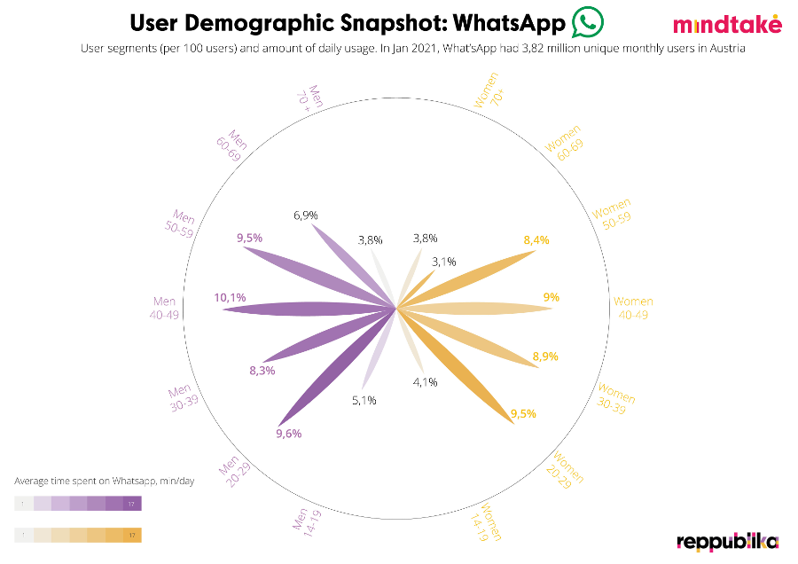 Whatsapp zählte im Januar 2021 3,82 Millionen Unique User. Die App ist sowohl bei Frauen, als auch bei Männern beliebt - wobei Männer mit insgesamt 53% etwas vor den Frauen liegen. Die Altersgruppen sind von 20-59 sehr ähnlich verteilt - nur die Altersgruppe der 60-69 Jährigen Männer liegt mit 6,9% vor jener der Frauen im selben Alter.