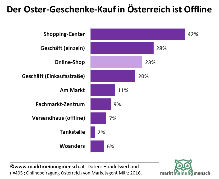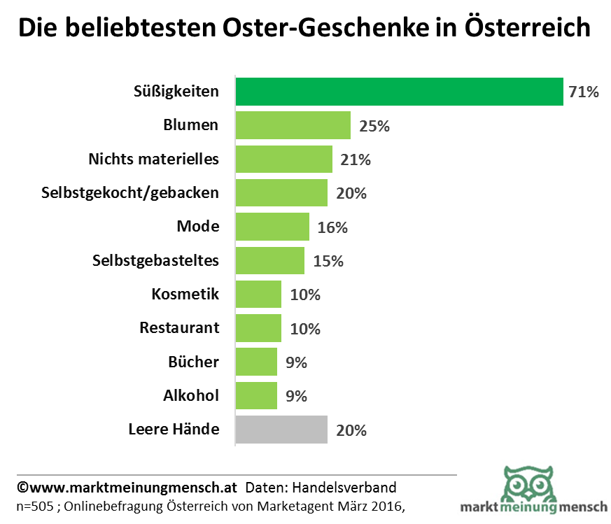 Ostern ist nach Weihnachten der wichtigste Geschenktag. Eine Umfrage zeigt die Österreicher schenken am liebsten Süßigkeiten (70 Prozent). Beschenkt werden in erster Linie Kinder und Partner. Die Geschenke kaufen die Befragten am liebsten im stationären Handel. Im Gegensatz zu Weihnachte ist Online-Shopping bei den Osterkäufen mit 20% noch schwach ausgeprägt.
