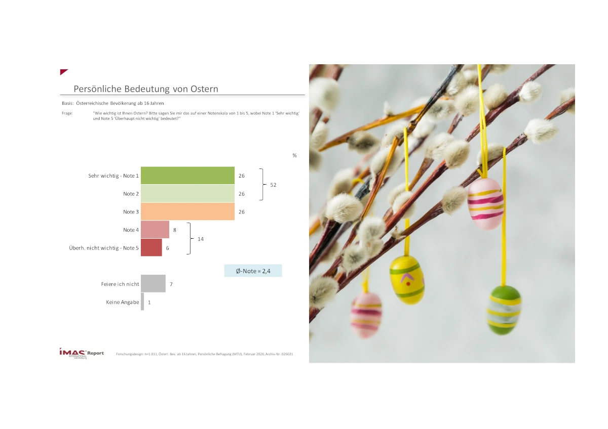Für rund die Hälfte der Bevölkerung hat das Fest eine große Bedeutung – insbesondere Traditionen und Bräuche spielen dabei eine zentrale Rolle. Die Österreicher:innen ab 16 Jahren bewerten Ostern insgesamt als wichtigen Bestandteil ihres Lebens.
