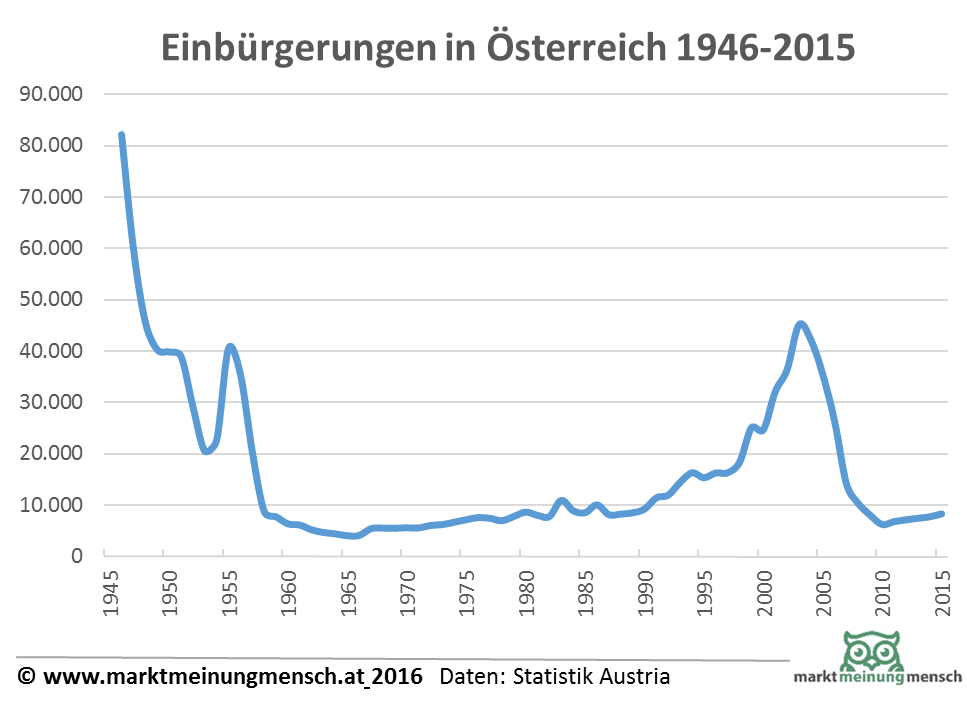 Seit dem Rekordjahr 2003 (45.112 Fälle) sanken die Einbürgerungszahlen kontinuierlich und erreichten im Jahr 2010 mit 6.190 den niedrigsten Wert. In den Jahren seit 2011 (6.754) stiegen die Einbürgerungen wieder, so auch 2015 (8.265). Die vorläufige Einbürgerungsrate – Einbürgerungen von in Österreich wohnhaften Personen (8.144) bezogen auf 100 in Österreich lebende Personen mit nichtösterreichischer Staatsangehörigkeit – lag 2015 wie im Vorjahr bei 0,7%.