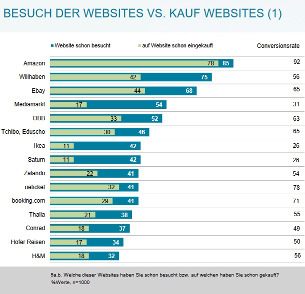 - Bei erfolgten Käufen liegt Amazon klar vor ebay , Willhaben , ÖBB, oeticket und Tchibo/Eduscho; die höchsten Konversionsraten (Kauf auf Basis Besuch) erzielen nach Amazon die Websites oeticket und booking.com