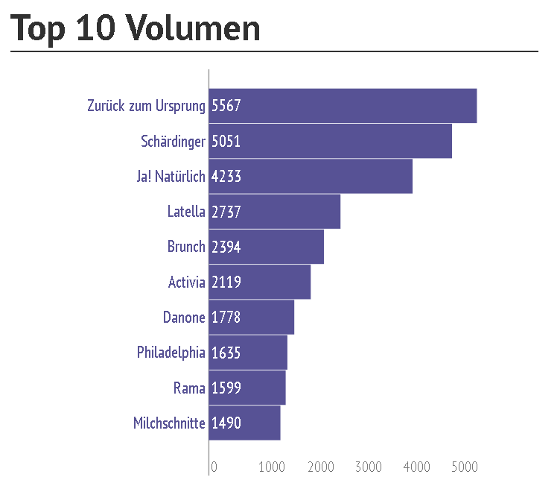 Vor allem Zurück zum Ursprung hat in diesem Jahr wie keine andere Marke aus der Branche polarisiert. Ein zweiter großer Themenbereich in den Online-Diskussionen stellen die Fernsehwerbungen dar. Der Schärdinand von Schärdinger führte beinahe zu einem Shitstorm und auch Activia erntet für seine neue Werbekampagne viel Spott auf zahlreichen Online-Plattformen. Beim Diskussionsvolumen sind Soya- und Laktose freie Produkte weiterhin auf dem Vormarsch.