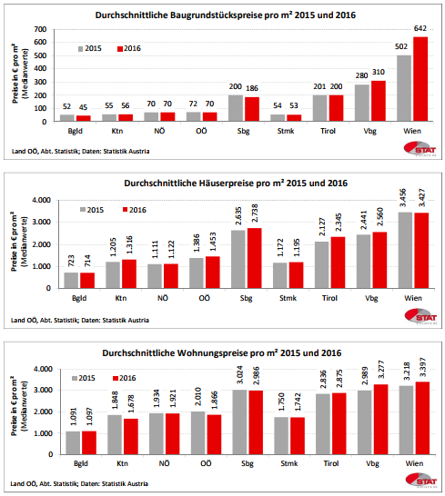 Die Statistik zeigt die durchschnittliche Baugrundstücks-, Häuser- und Wohnungspreise in den Jahren 2015 und 2016 in Österreich im Bundesländervergleich.