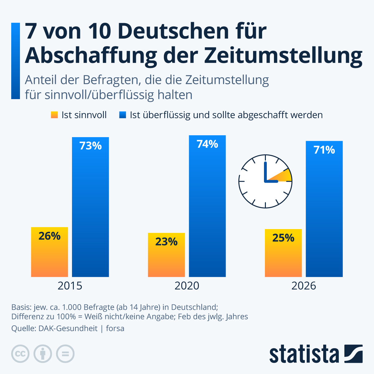 Laut regelmäßiger forsa-Umfragen im Auftrag der DAK-Gesundheit, die seit über einem Jahrzehnt Deutsche ab 14 Jahren befragt, wünschen sich rund 70 Prozent die Abschaffung der Maßnahme. Auch 2026 werden die Uhren am letzten Märzwochenende – in der Nacht vom 28. auf den 29. März – wieder von Winter- auf Sommerzeit gestellt. Die ablehnende Haltung hat sich über die Jahre kaum verändert.