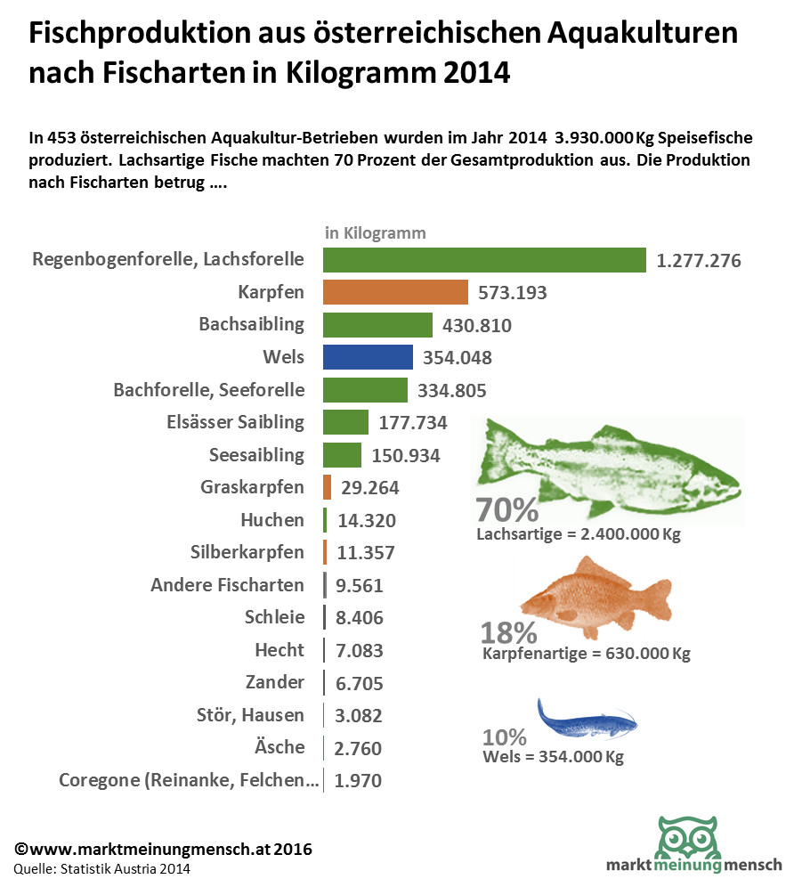 Die Infografik zeigt die Speisefischproduktion im Jahr 2014. In 453 österreichischen Aquakultur-Betrieben wurden im Jahr 2014 3.930.000 Kg Speisefische produziert. Lachsartige Fische machten 70 Prozent der Gesamtproduktion aus.