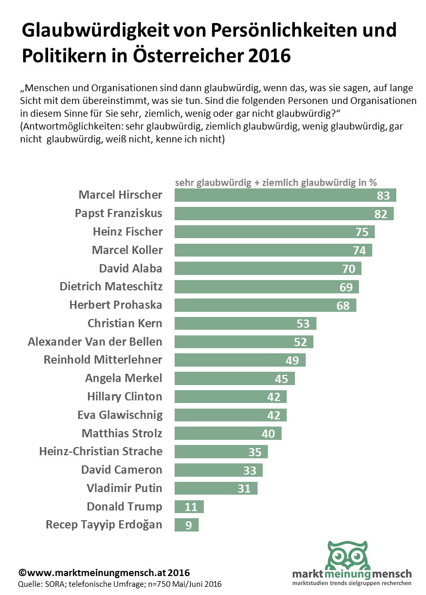 Die Infografik zeigt die Ergebnisse einer Umfrage zur Glaubwürdigkeit von Politikern, Prominenten und Persönlichkeiten des öffentlichen Lebens aus der Sicht der Österreicher. Das Glaubwürdigkeits-Ranking wird von Marcel Hirscher, Papst Franziskus und Bundespräsident Heinz Fischer angeführt. Im Mittelfeld: Alexander van der Bellen. Am unreren Ende der Skala: Putin, Trump und Erdogan.