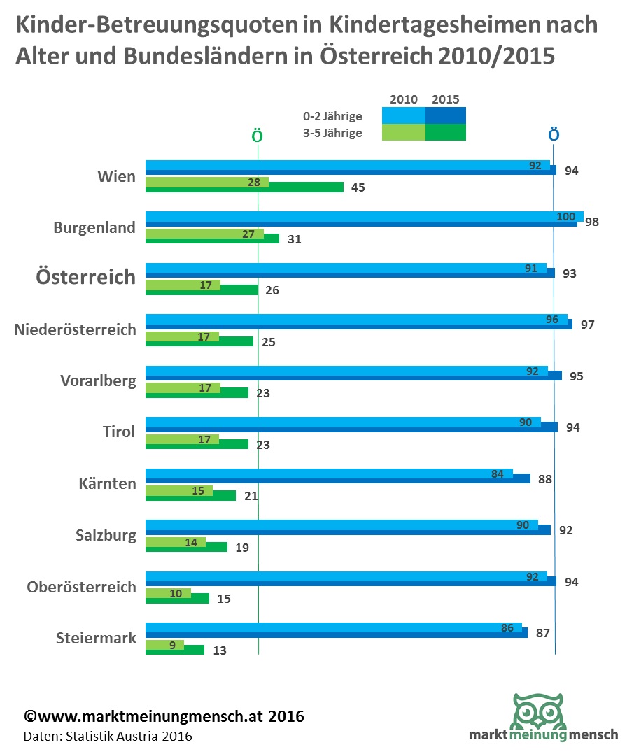 Die Infografik zeigt die Statistik der Kinderbetreuungsquoten nach Alter und Bundesland in den Jahren 2010 und 2015 im Vergleich. Demnach liegt 2015 die Kinderbetreuung der 0- bis 2-Jährigen in Österreich bei 26 Prozent und ist gegenüber 2010 um 9 Prozentpunkte gestiegen. Bei den 3- bis 5-Jährigen ist die Betreungsquote um 2 Prozentpunkte auf 93 Prozent gestiegen. Wien und Burgenland haben die höchsten, Oberösterreich und die Steiermark die niedrigsten Betreuungsquoten.