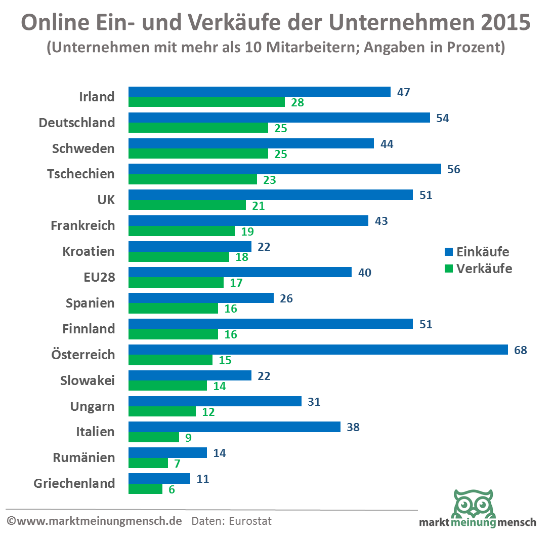 Die Statistik des Eurostats zeigt den Grad der Digitalisierung von Unternehmen für alle Staaten der Europäischen Union im Jahr 2015. Die Statistik ist auf Unternehmen mit mehr als 10 Mitarbeitern eingeschränkt. Bei den Online-Einkäufen ist Österreich und Deutschland Spitzenreiter im EU Vergleich.