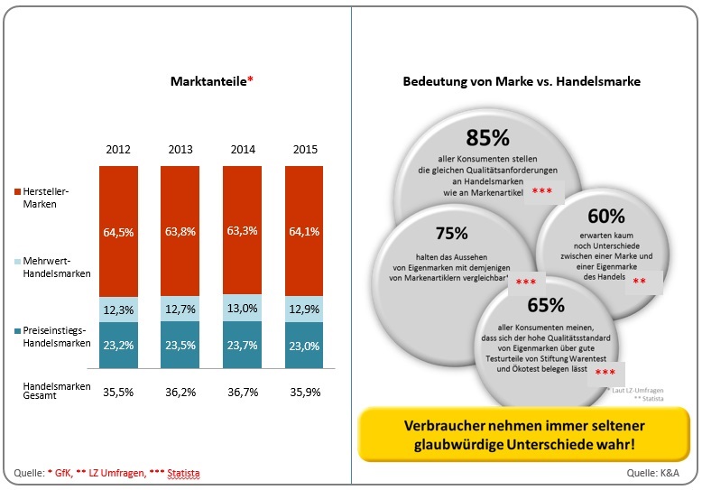 Da hat es der Handel leichter. Er braucht bei seinen Eigenmarken auf zurückliegende Markentraditionen und Selbstähnlichkeiten kaum Rücksicht zu nehmen, weil es diese bis vor Kurzem nicht gab: Er insziniert seine Retailbrands neu und wie er es für richtig hält. Und er hat mit seiner Filialhoheit ausreichend Möglichkeiten, seine Marken für Verbraucher erlebnisreich zu gestalten. Der Marktanteil von preisaggressiven Handelsmarken stieg bis 2010 unaufhörlich; seit jener Zeit performen aber die Mehrwert-Eigenmarken. Laut Statista-Analysen stellen heute mehr als 85% aller Konsumenten die gleichen Qualitätsanforderungen an Handelsmarken wie an Markenartikel und für rund 75% aller Verbraucher hält das Aussehen von Eigenmarken mit denjenigen von Markenartiklern mit. Laut LZ-Umfragen schwindet zudem das unabdingbare Vertrauen der Verbraucher in Markenartikel Jahr für Jahr: Mehr als 60% aller Konsumenten erwarten kaum noch Unterschiede zwischen Produkten einer Marke oder Eigenmarke des Handels.