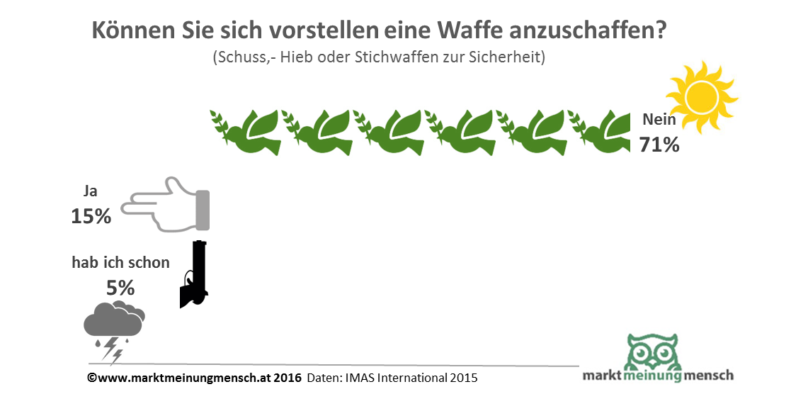 Ein Viertel der ÖsterreicherInnen fühlt sich in den eigenen vier Wänden sehr sicher, jeder Zweite einigermaßen sicher. 40 Prozent der Einfamilienhausbesitzer haben bereits Maßnahmen getroffen, um zum Beispiel gegen Einbrüche gewappnet zu sein. 15 Prozent können sich den Kauf einer Schuss-, Hieb- oder Stichwaffe zum Schutz der eigenen vier Wände vorstellen. 5 Prozent beseitzen bereits eine Waffe. Immerhin lehnen 7 von 10 ÖsterreicherInnen den Kauf einer Waffe ab.