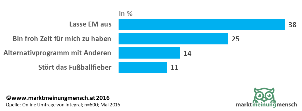 Nahezu alle Österreicher wissen um die bevorstehende Fußballeuropameisterschaft in Frankreich. 60 der Österreicher Prozent wollen sich zumindest einige Spiele ansehen. Immerhin 8 Prozent sind völlig „fußballnarrisch“ und werden sich alle Spiele ansehen – 16 Prozent die meisten Matches. Die Spiele der österreichischen Nationalmannschaft werden knapp 40 Prozent der von Integral Befragten fiebernd verfolgen. Immerhin 21 Prozent wollen sich primär die Spiele einer anderen Mannschaft ansehen.