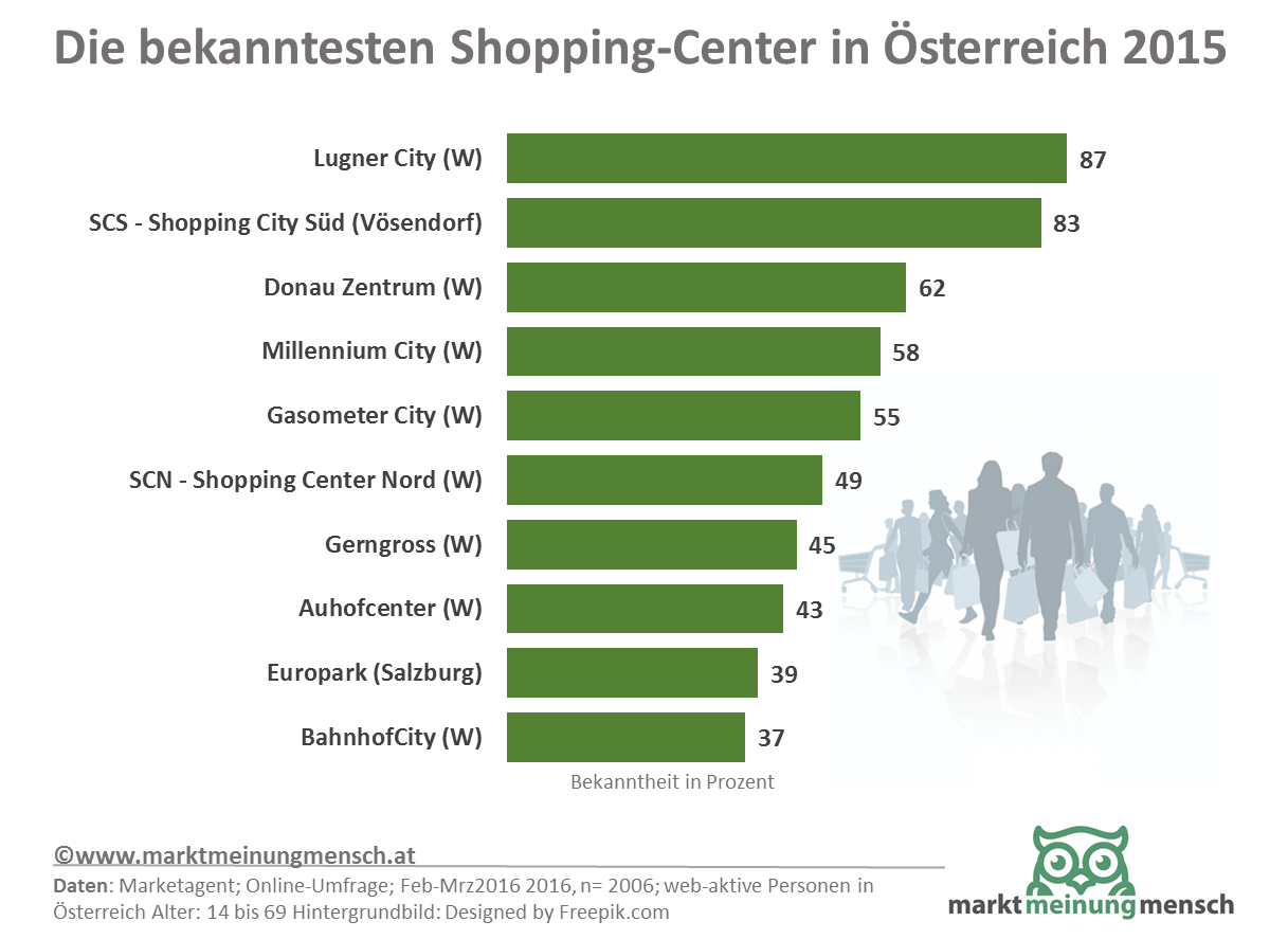 Die Infografiken zeigen die bekanntesten Shopping-Center Österreichs, die Anforderunggen der Kunden an ein Einkaufszentrum und das Ranking nach unterschiedlichen Kriterien.
