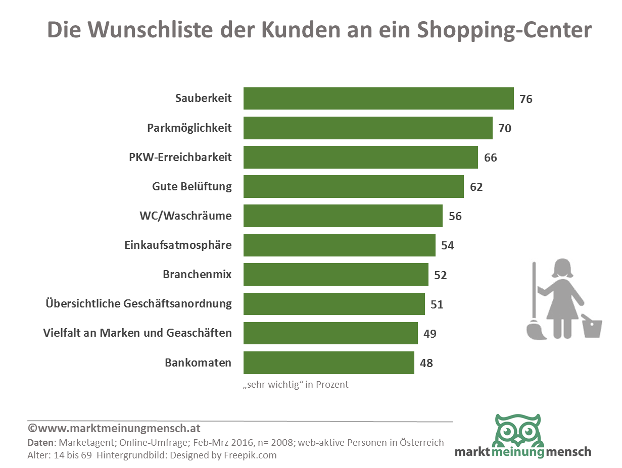 Sauberkeit, Parkmöglichkeiten und gute Erreichbarkeit mit dem PKW sind den Kunden die wichtigsten Kriterien für den Besuch eines Shopping-Centers. Der Branchenmix kommt erst im Mittelfeld der Wunschliste. Gute Luft, ausreichende Sanitärräume und eine feine Atmosphäre sind den Besuchern eines Einkaufszentrums dann doch noch wichtiger.