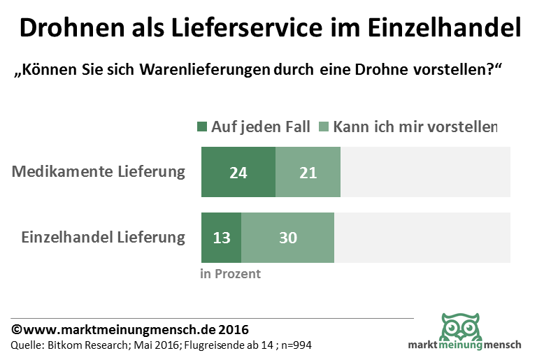 Die Umfrage analysiert das Interesse an den unbemannten Luftfahrzeugen für die Warenlieferung. 13 Prozent der Befragten deutschen Flugreisenden würden sich auf jeden Fall Einzelhandels-Waren per Drohne liefern lassen, und 30 Prozent können sich das vorstellen. Ein Beispiel aus den USA zeigt eine Anwendung des Einsatze von Drohnen zur Medikamenten-Zustellung.