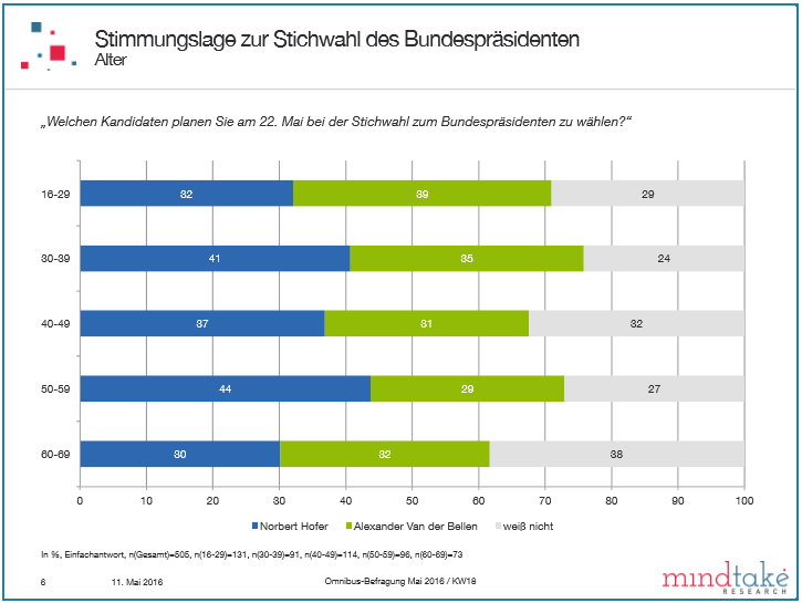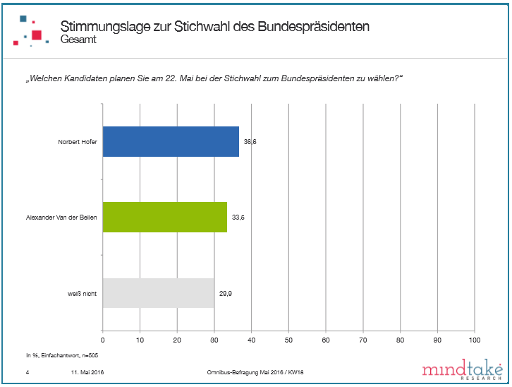 Die aktuellste Umfrage zur Bundespräsidentschaftswahl (MindTake Research im Auftrag von ServusTV) zeigt die Stimmungslage und aktuelle Wahlabsichten vor der Stichwahl des Bundespräsidenten. Hofer liegt knapp vor Van der Bellen. 30 Prozent sind noch unentschlossen. Die Ergebnisse sind nach Bundesländern, Alter und Geschlecht dargestellt.