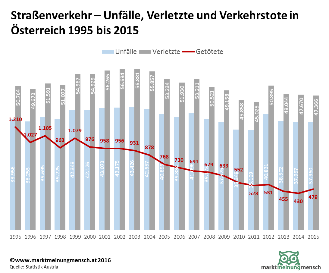 Die Infografik zeigt die Statistik der Verkehrsunfälle mit Personenschaden von 1995 bis 2015. Obwohl die Anzahl der Verkehrsunfälle mit Personenschaden 2015 gegenüber 2014 mit 37.960 nahezu gleich geblieben ist, stieg die Anzahl der Verkehrstoten um 11 Prozent auf 479 Todesopfer.Der kuntinuierliche Abwärtstrend bei den Straßenverkehrsopfern seit 1999 ist damit 2015 zum ersten mal wieder angestiegen.