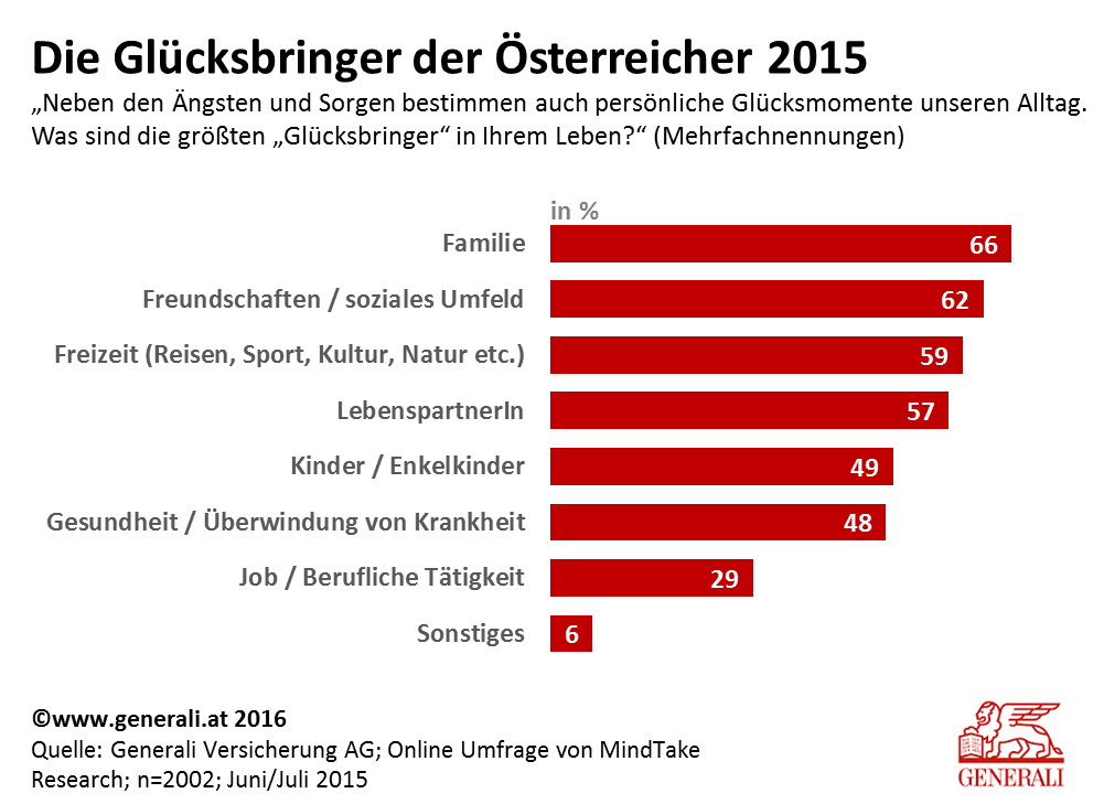 Gefragt, welche Glücksbringer den Österreichern die größten Glücksmomente verdanken, stehen Familie, Freundschaft und Freizeit ganz oben. Der Job findet sich dann eher am Ende der Glücksbringerskala.