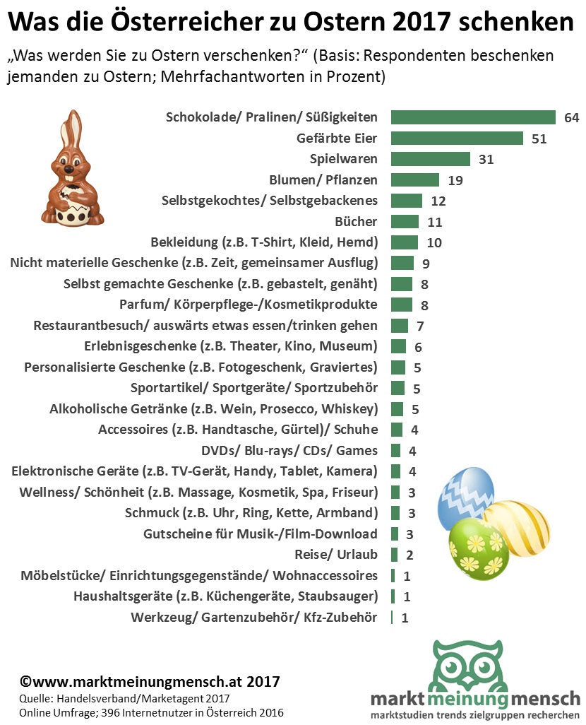 Die Infografik zeigt die Statistik zu einer Umfrage, was die Österreicher ihren Liebsten zu Ostern 2017 schenken wollen. Die Hitliste der Ostergeschenke wird von Süßigkeiten wie Schokolade und Pralinen angeführt. Auf den Rängen: Ostereier, Spielwaren und Blumen.