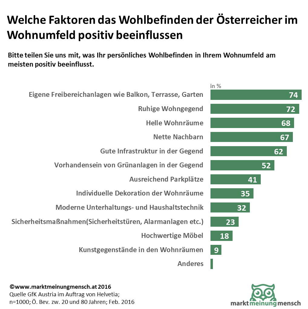 Die Infografik zeigt die Ergebnisse einer Umfrage von GfK im Auftrag von Helvetia zu den Faktoren der Wohnzufriedenheit in Österreich 2016. Eigene Freibereiche, Ruhelage, helle Wohnräume, nette Nachbarn und eine gute Infrastruktur in der Wohngegend sind die Top-Wohlfühlfaktoren im Wohnumfeld.