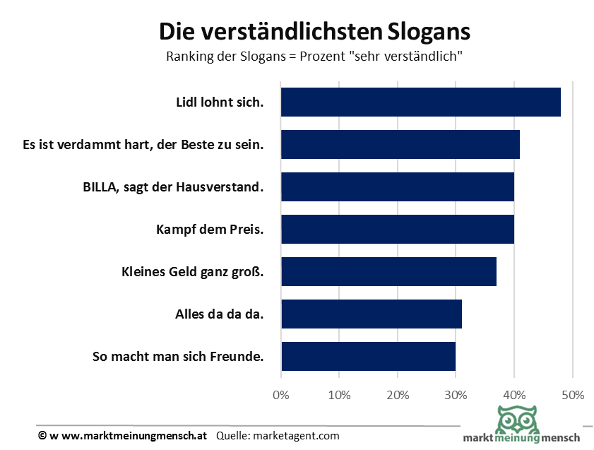 In einer Online-Umfrage von marketagent wurden die Werbeslogans des österreichischen Lebensmittelhandels hinsichtlich Bekanntheit und Eigenschaften aus Kundensicht bewertet. "Sagt der Hausverstand" ist, gefolgt von "verdammt Hart" und "alles da da da" der einprägsamste Slogan. Spannendes Detail: Der zweitplazierte Merkur-Slogan ist bereits ein knappes Jahr "Off the Air". Der neue Merkur-Slogan "so macht man sich Freunde" rangiert auf Platz 7