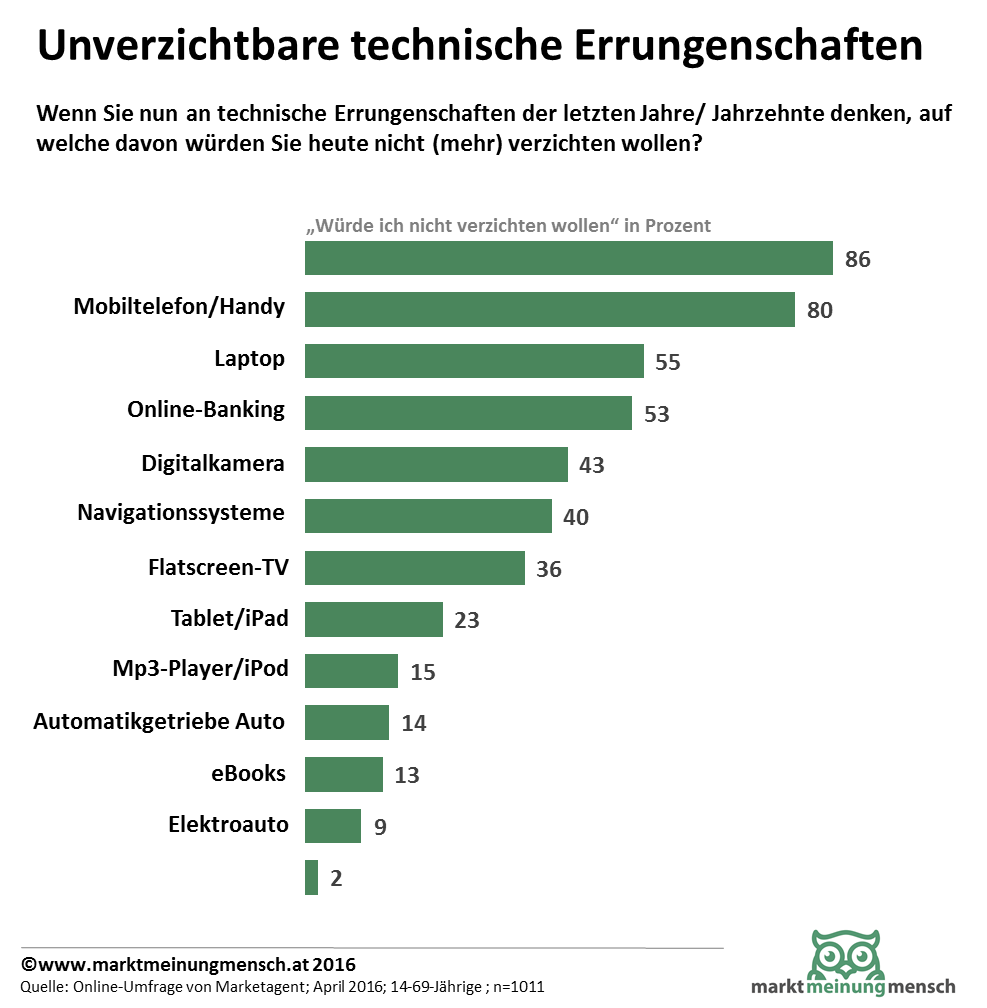 Die Infografik zeigt auf welche Errungenschaften des technischen Fortschritts die Österreicher nicht mehr verzichten wollen.