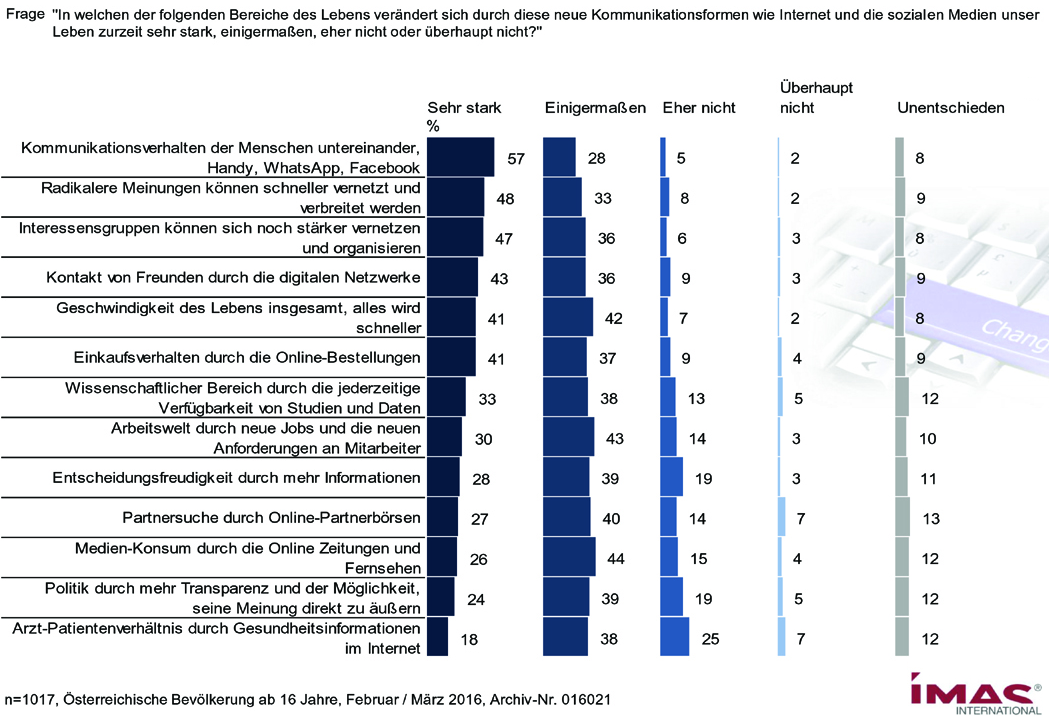 Kommunikation, Vernetzung mit Freunden und Interessensgruppen, Einkaufsverhalten, Wissensgesellschaft, Arbeitswelt, Mediennutzung und Politik - Die Österreicher empfinden die Veränderung durch Internet und Soziale Medien mehrheitlich als Revolution, nicht als Evolution.