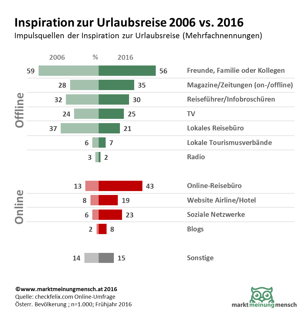 Die Inspirationsquellen der Österreicher für die Urlaubsreise haben sich in den letzten zehn Jahren stark verändert. 2006 war für 2 von 3 Österreichern (59 Prozent) die Empfehlung von Familie, Freunden und Kollegen der wichtigste Impulsgeber, um sich für die nächste Reise inspirieren zu lassen. Das stationäre Reisebüro vor Ort (37 Prozent) und klassische Reiseführern (32 Prozent) waren an zweiter und dritter Stelle der wichtigen Inspirationsquellen. Nur 13 Prozent der Befragten suchten Inspirationen bei Online-Reisebüros. Soziale Media (6 Prozent) waren seinerzeit für Österreicher kaum von Bedeutung.