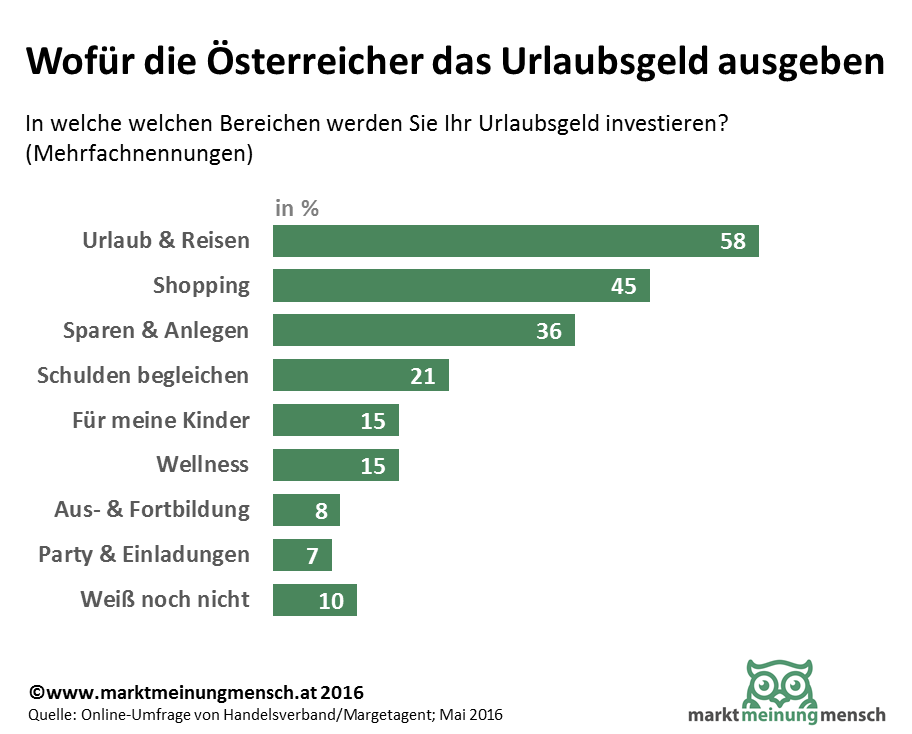 Die Infografik zeigt auf Basis einer Umfrage: Knapp 60 Prozent der Österreicher geben ihr Urlaubsgeld "zweckgebunden" für Urlaub und Reisen aus. Immerhin 45 Prozent planen einen Teil zum Shoppen im Einzelhandel auszugeben. Über ein Drittel möchte das Geld anlegen und immerhin jeder Fünfte benötigt das 13. und 14. Gehalt, um offene Rechnungen und Schulden zu begleichen.