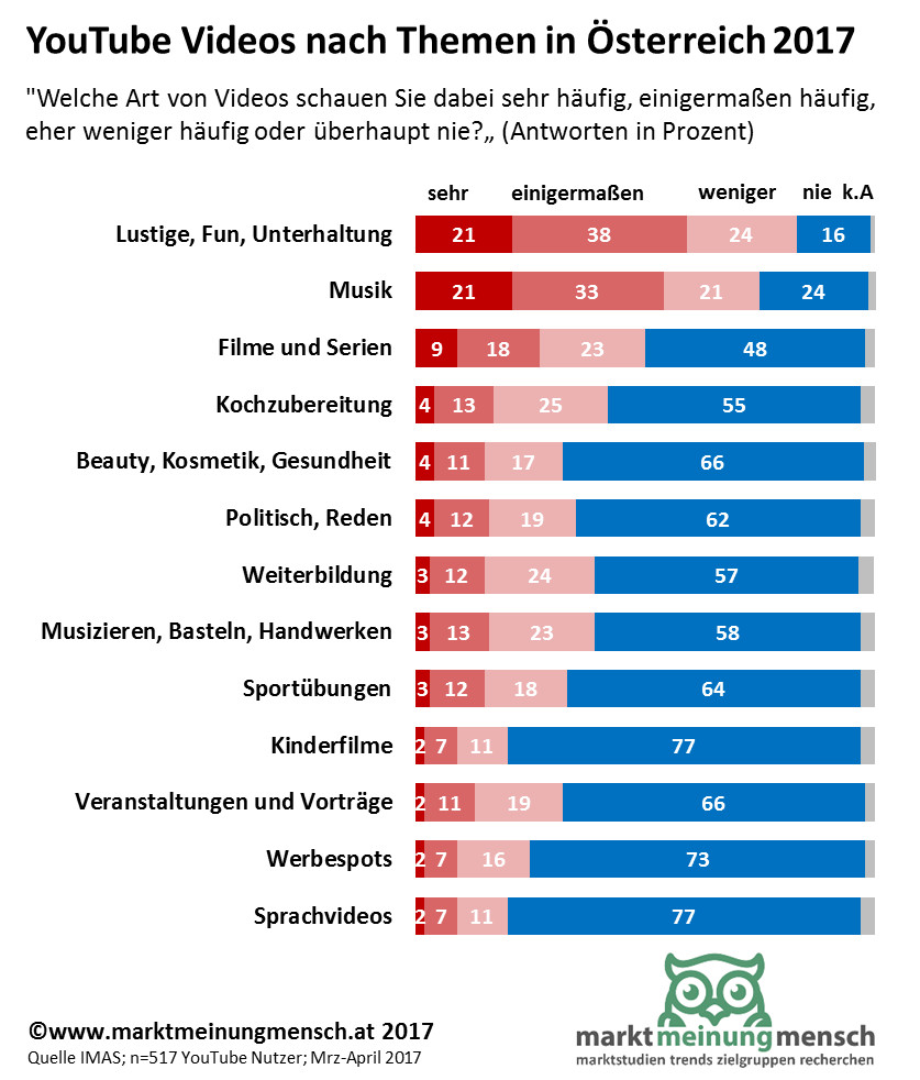 Die Infografik zeigt die Statistik zu einer IMAS-Umfrage unter YouTube-Nutzern, welche Video-Themen ab beliebtesten sind. Die häufigsten Genres von gesehenen Videos lauten Lustige Videos und Musikvideos. Mit Abstand folgen Filme und Serien, Kochzubereitungen und BeautyTipps.